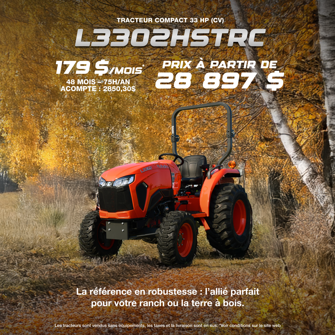 *Offre de location disponible sur approbation de crédit. Exemple de location représentatif basé sur un L3302HSTRC neuf et non immatriculé auparavant. Le prix de location est de 28 896,99 $. Taux de location de 0 % (taux effectif de de 2,75 %) pendant 48 mois. Le paiement mensuel de location est de 179,00 $ et comprend : 831,01 $ en frais de transport; les frais réglementaires (jusqu'à 3,72 $) ; les frais d’inscription d’un droit (jusqu'à 394,00 $, y compris les frais de l'agent d’inscription) ; ainsi que tous les autres frais, droits et redevances applicables (qui peuvent tous varier selon la région et le concessionnaire). Les assurances, l'immatriculation et les taxes de vente applicables sont en sus. Acompte de 2 850,30 $ ou valeur de reprise équivalente et dépôt de garantie de 0,00 $ dus au début du contrat de location. L'obligation totale de location est de 8 592,00 $. Total de 48 paiements mensuels requis pendant la durée du contrat de location. Allocation de 300 heures ; frais de 30,00 $ / hr pour les kilomètres supplémentaires. Le concessionnaire peut louer à un prix inférieur. Une commande ou un échange du concessionnaire peut être nécessaire (mais peut ne pas être disponible dans tous les cas). L'offre prend fin le 30 november 2025 et peut être modifiée ou annulée sans préavis. Consultez votre concessionnaire Kubota participant.